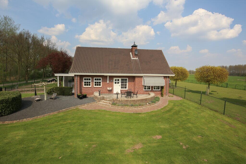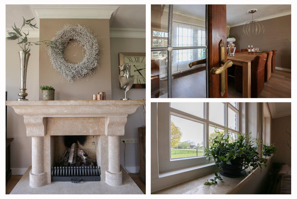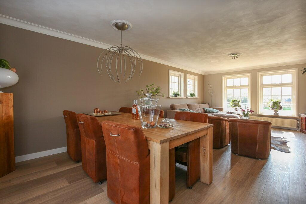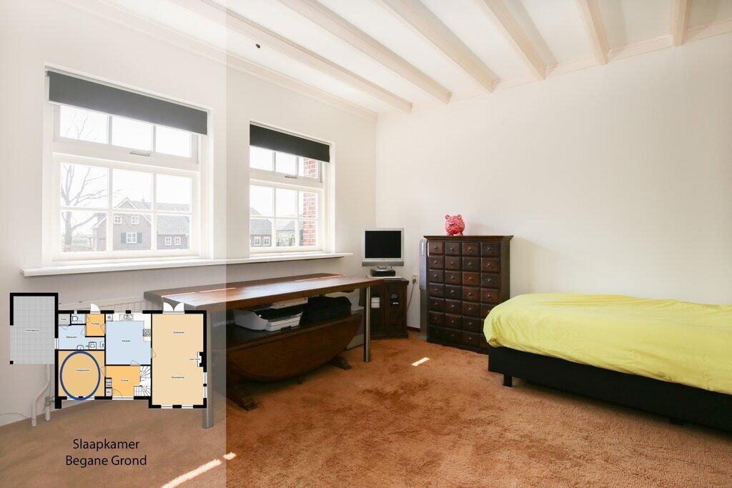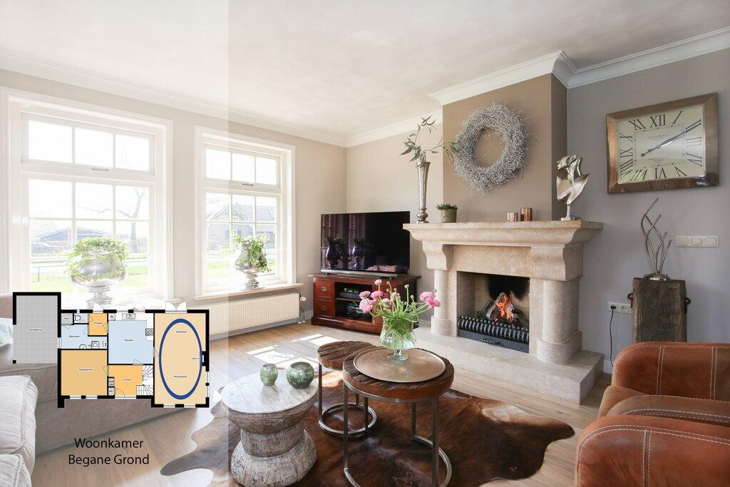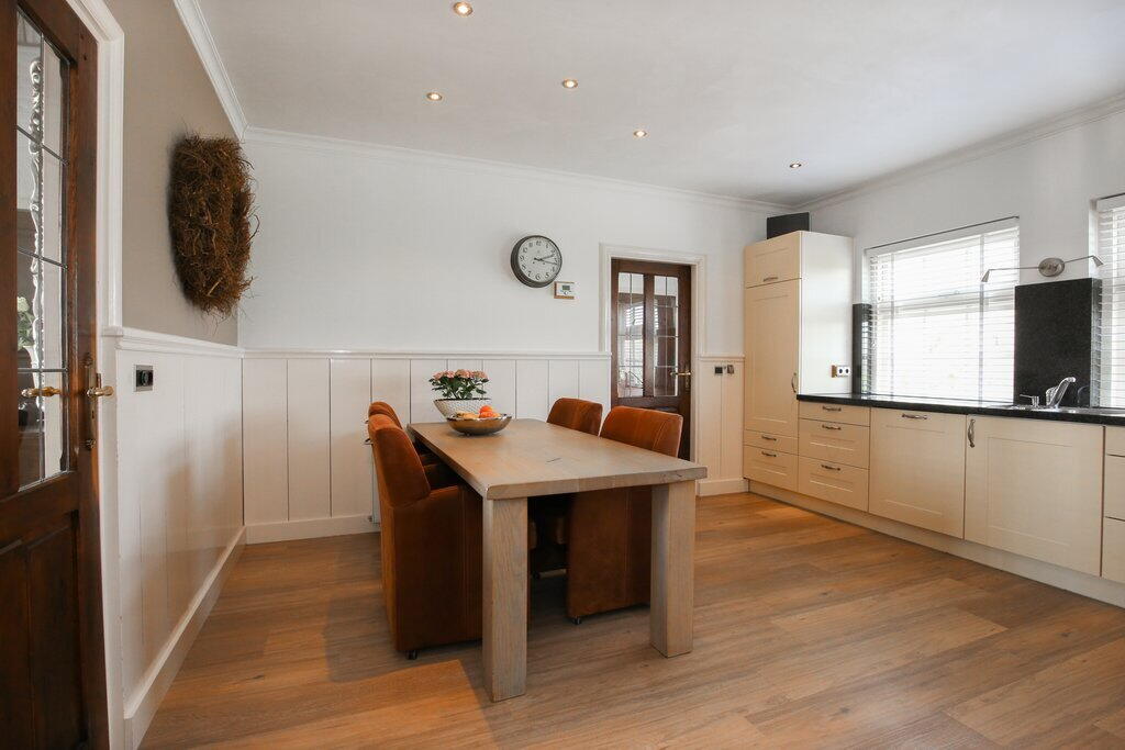 Centrale hal met vide en meterkast. De centrale hal biedt toegang tot de woonkeuken en de slaapkamer op de begane grond. De woonkamer met openslaande deuren naar de tuin is voorzien van een PCV-vloer en beschikt over een natuursteen schouw met daarin een gashaard. De woonkeuken beschikt over een uitgebreide keukeninrichting en een granieten aanrechtblad, vanuit de keuken bereikt u het achterportaal met toilet (wandcloset) en bijkeuken met Cv-installatie, werkkast en de opstelling van de wasmachine -en wasdroger.