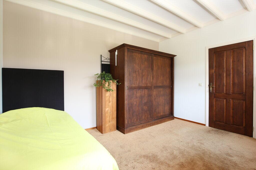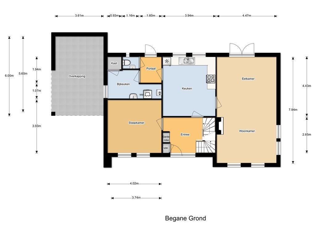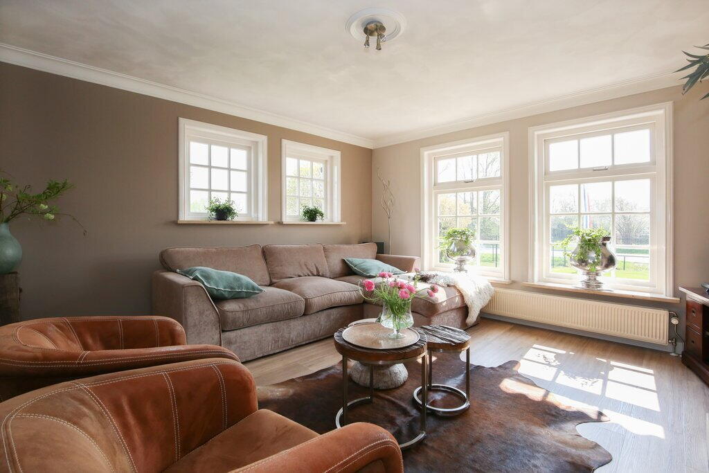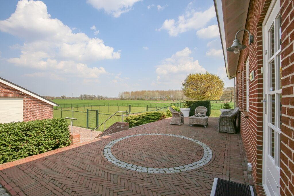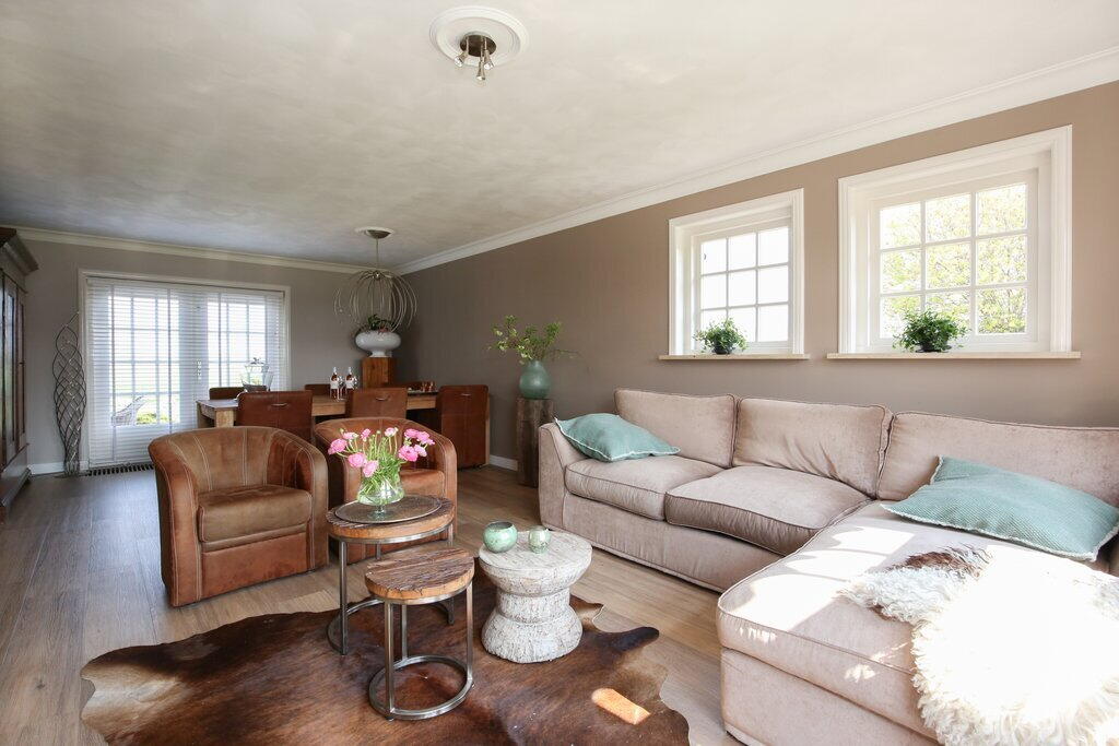 Centrale hal met vide en meterkast. De centrale hal biedt toegang tot de woonkeuken en de slaapkamer op de begane grond. De woonkamer met openslaande deuren naar de tuin is voorzien van een PCV-vloer en beschikt over een natuursteen schouw met daarin een gashaard. De woonkeuken beschikt over een uitgebreide keukeninrichting en een granieten aanrechtblad, vanuit de keuken bereikt u het achterportaal met toilet (wandcloset) en bijkeuken met Cv-installatie, werkkast en de opstelling van de wasmachine -en wasdroger.